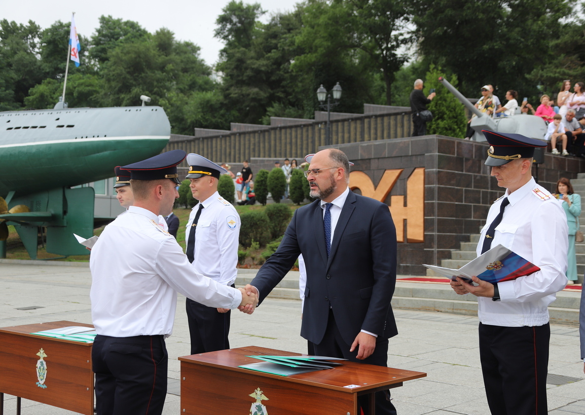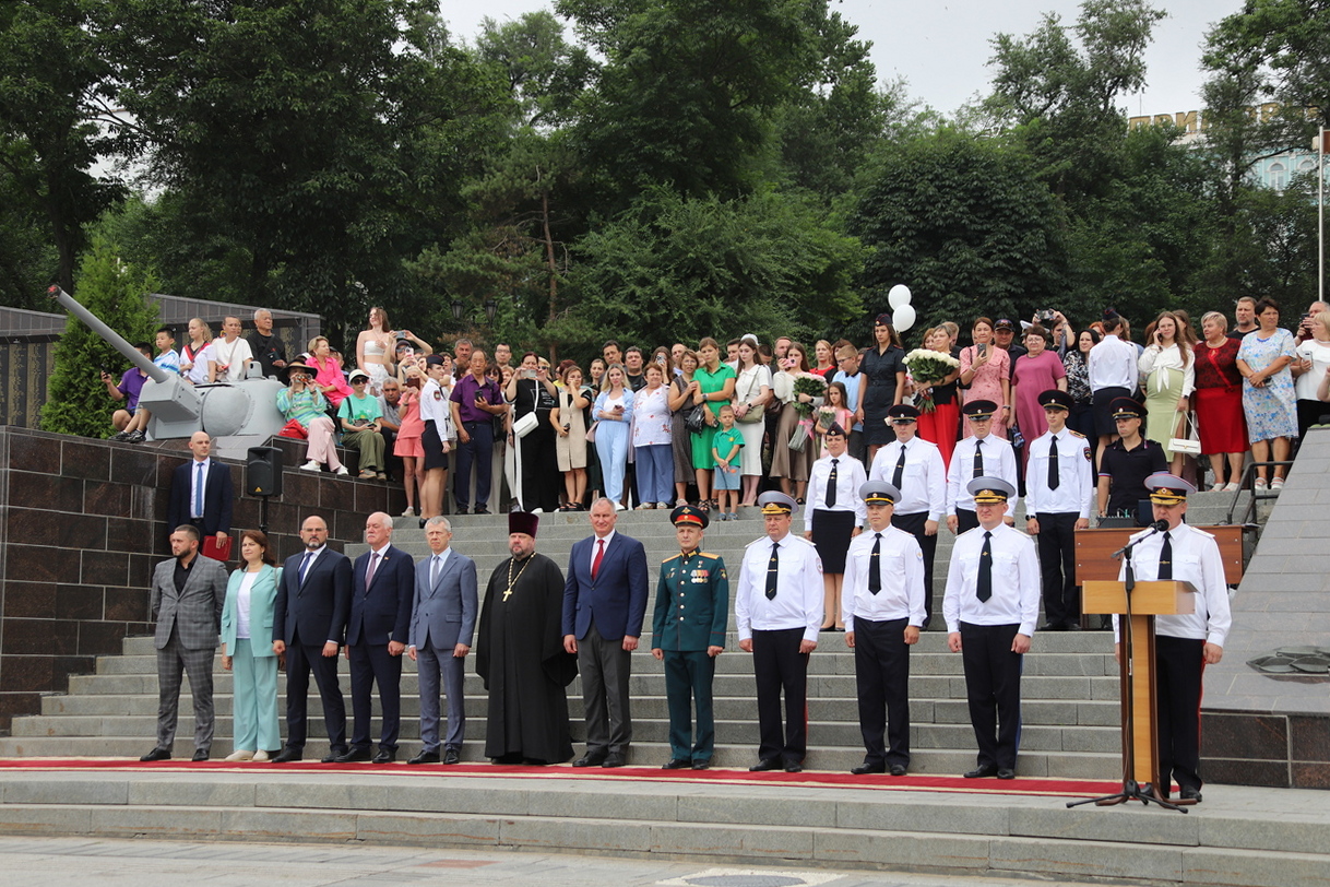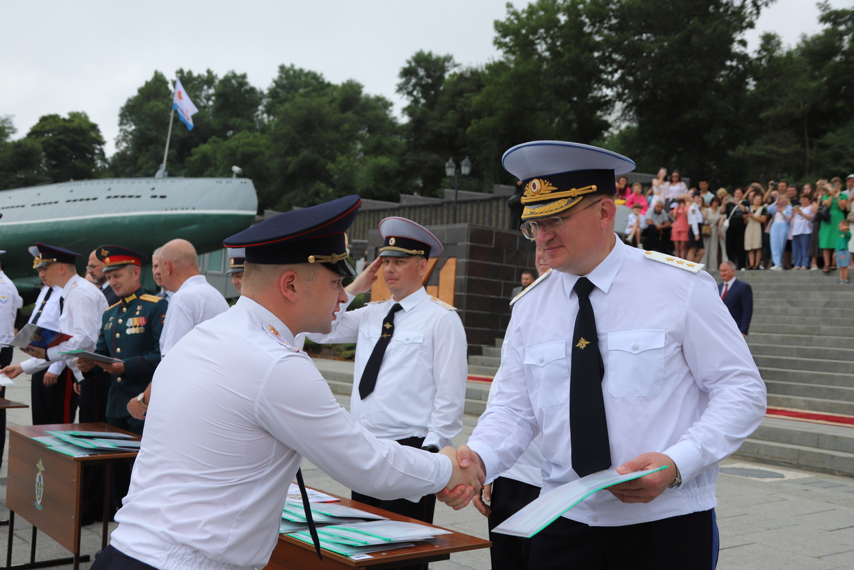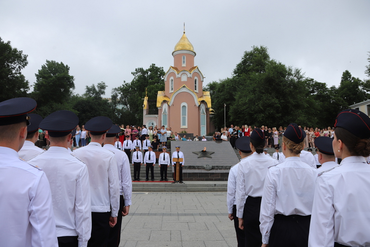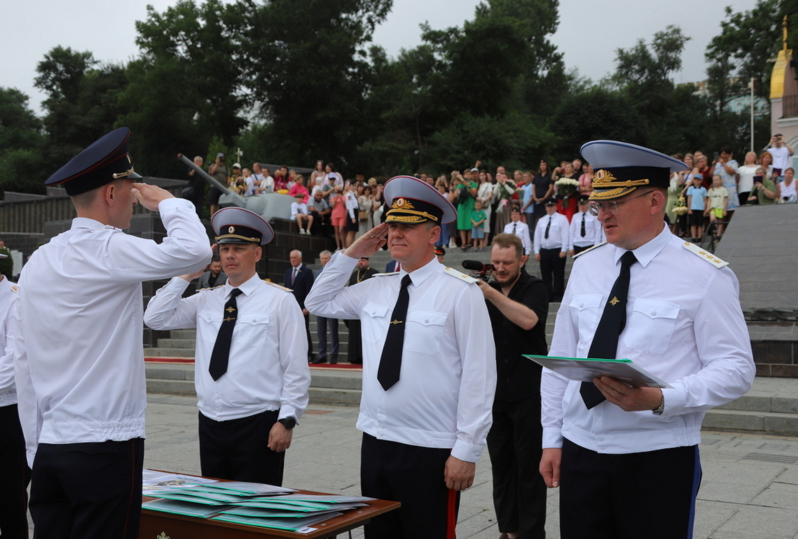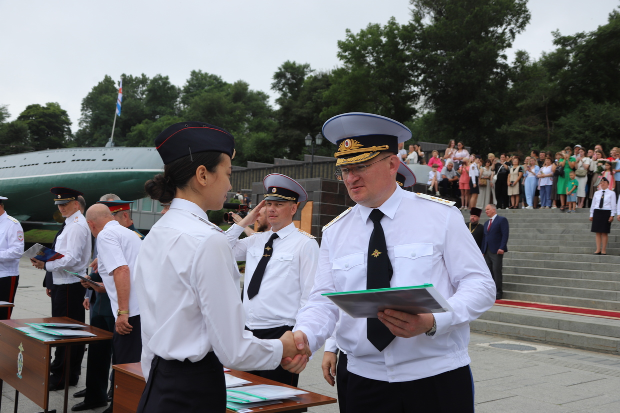 В торжественной церемонии выпуска слушателей пятого курса очной формы обучения Владивостокского филиала ФГКОУ ВО «ДВЮИ МВД России имени И.Ф. Шилова», которая состоялась у мемориального комплекса «Боевая слава Тихоокеанского флота» 1 августа, приняли участие руководители органов государственной власти и местного самоуправления, представители Владивостокской епархии Русской Православной Церкви, общественных организаций, ветераны, родственники выпускников.
